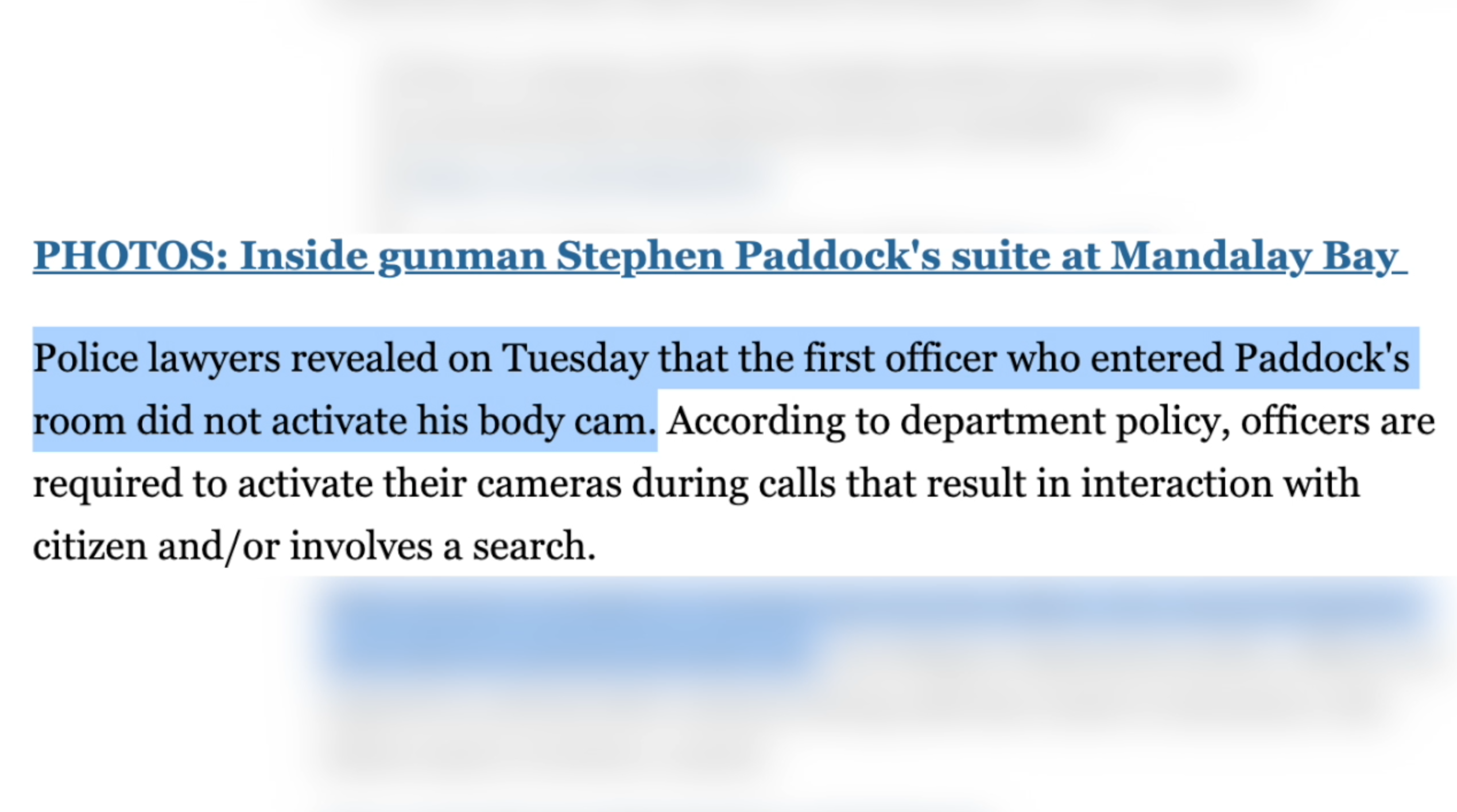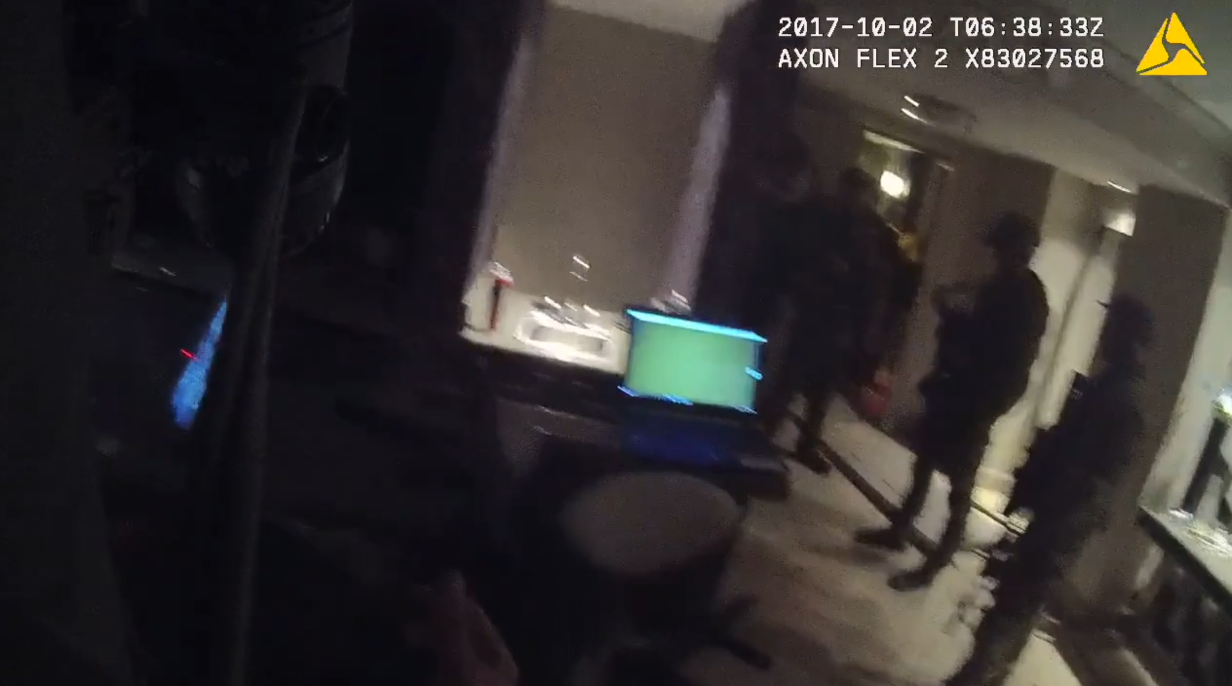 ” The body worn camera video from Officer Levi Hancock on 1 October is not new video. LVMPD has never claimed Officer Hancocks video did not exist. We did state Officer Hancock did not have his BWC activated at the time of the breach on 1 October. Other officers did have their BWCs activated at that time. And those first videos of the breach were released in May of 2018. Several minutes after Officer Hancock entered the room on 1 October, he realized his body worn camera was not activated. He then turned it on. In the first moments of Officer Hancocks video, you see him working with another officer looking at evidence. Those same moments are captured on other officers BWC. The allegation that LVMPD hid Officer Hancocks video from the public is false and misleading.” Spokesperson from LMVPD’s Office of Public Information