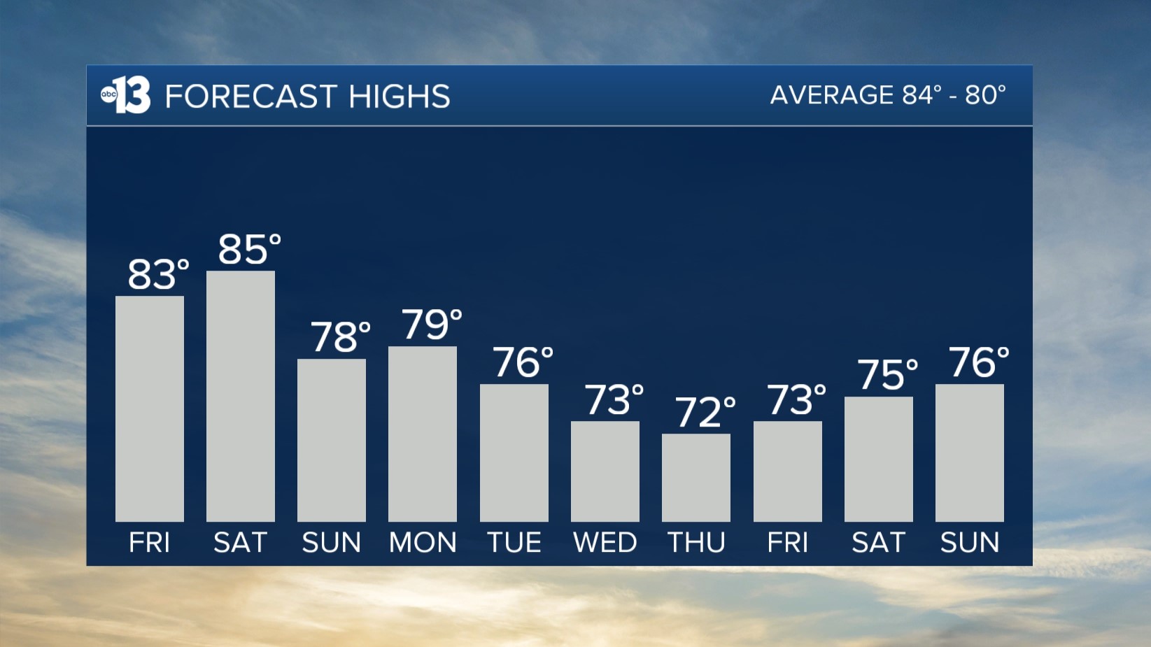 Nighttime and early morning lows in the upper 60s tonight drop to the low 60s Saturday night and the upper 50s starting Sunday night. Some neighborhoods will be in the low 50s by the middle of next week.