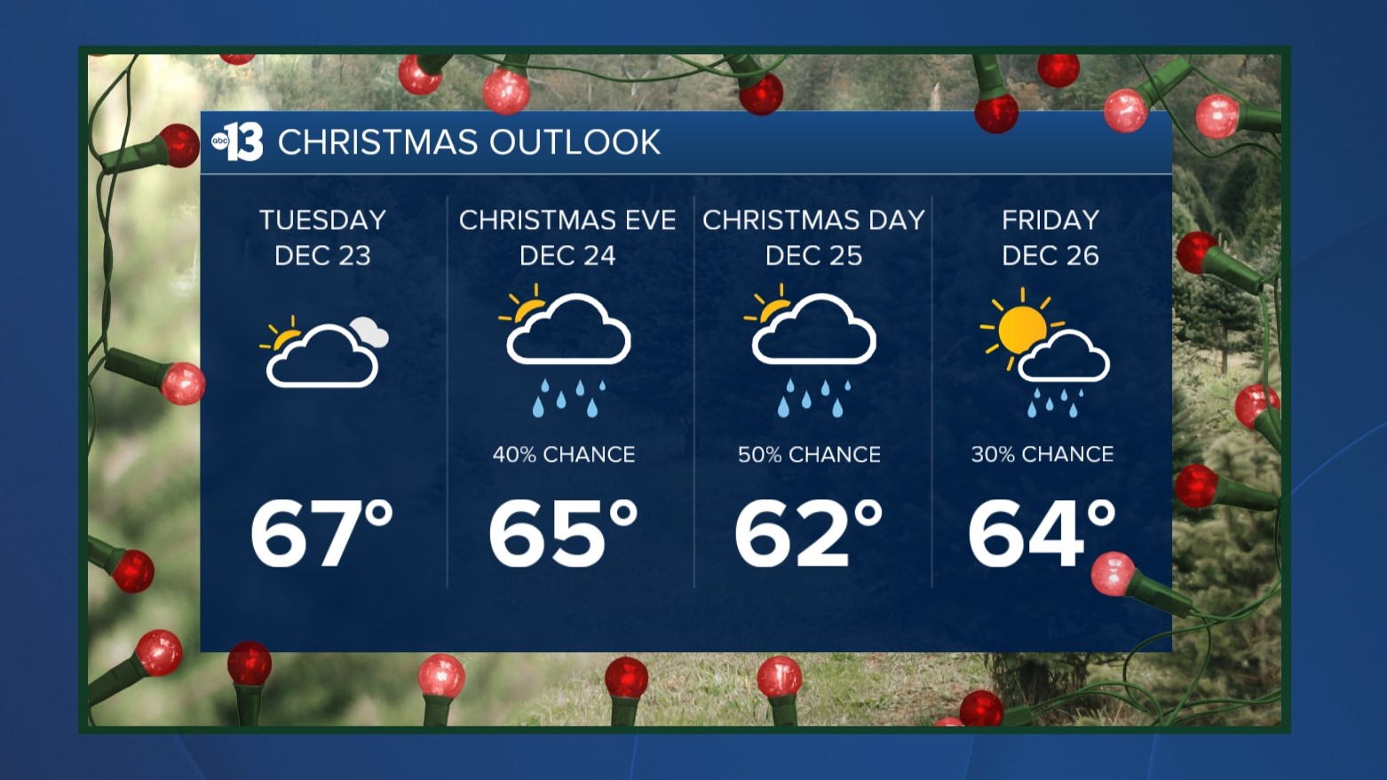 Rain chances pick up to 40% on Christmas Eve (Wednesday) as highs remain in the mid 60s. Showers are possible that night, as well as Christmas Day (50% chance) when highs dip to the low 60s. Friday brings low-to-mid 60s with a 30% chance of a few more showers.