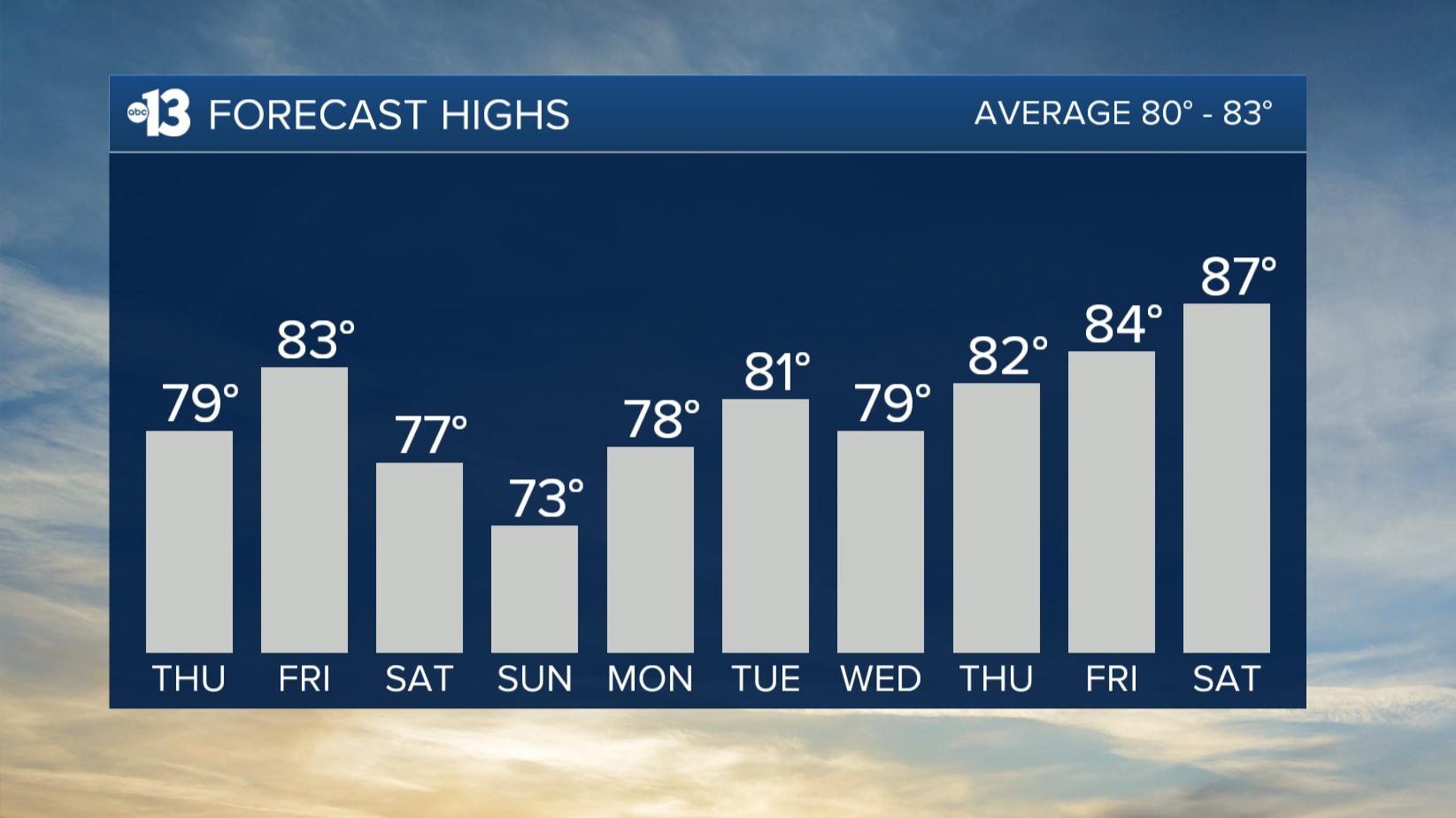 A blustery weekend is ahead: Saturday sees 30 mph gusts and Sunday sees 25 mph gusts. The breezes are expected from start to finish each day. Partly-to-mostly cloudy conditions on Saturday bring a 20% shower chance and limit highs to the mid 70s. Sunday is partly cloudy with 50s at daybreak and in the low 70s in the afternoon.