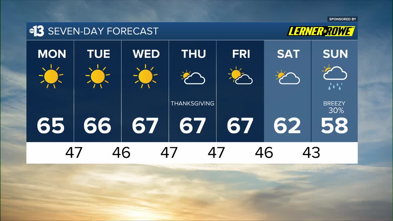 Thanksgiving begins at 47 around 7 a.m. and sees a mix of clouds and partial sun with afternoon highs near 67.