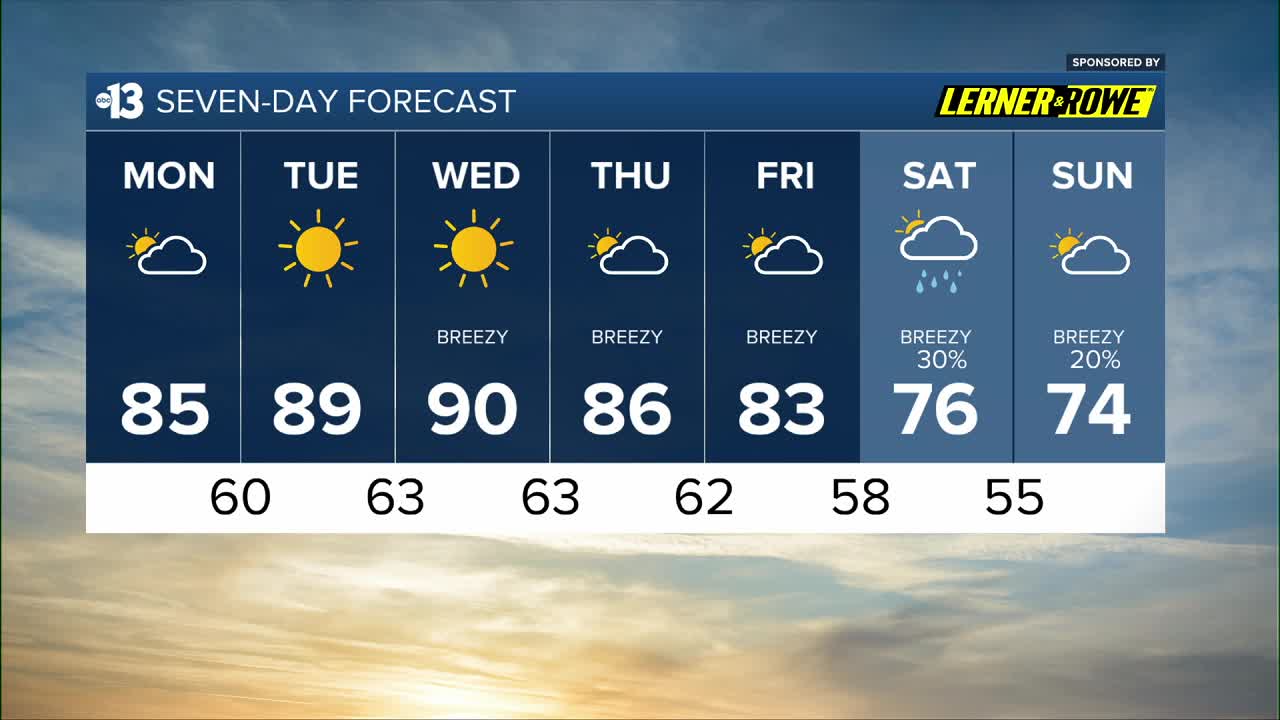 Breezes pick up starting midweek; expect 20 mph gusts Wednesday, and 25 mph gusts Thursday, Friday, and Saturday.