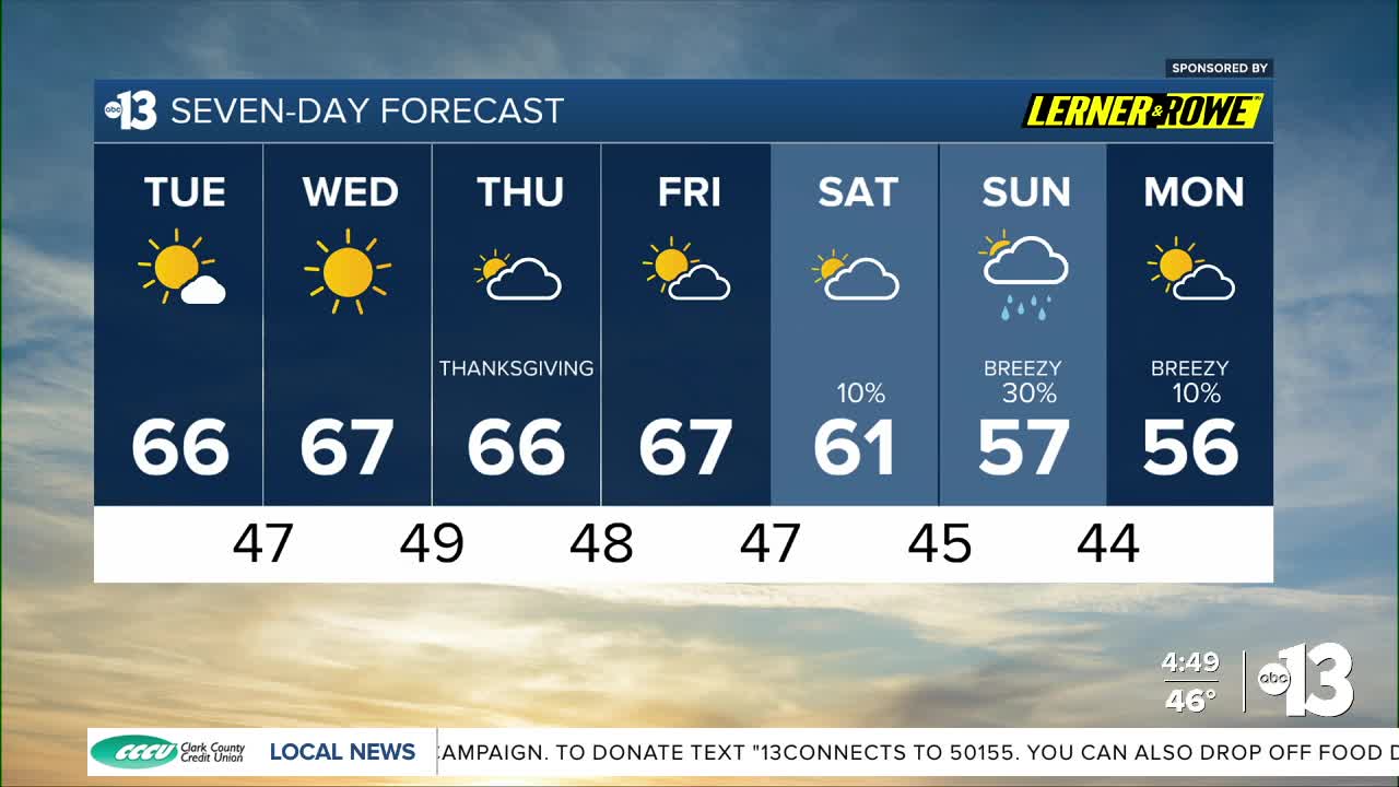 Chilly nights and early mornings in the mid-to-upper 40s will give way to afternoon highs in the mid 60s each day through Thanksgiving and Black Friday. Light winds are a part of the forecast, too.