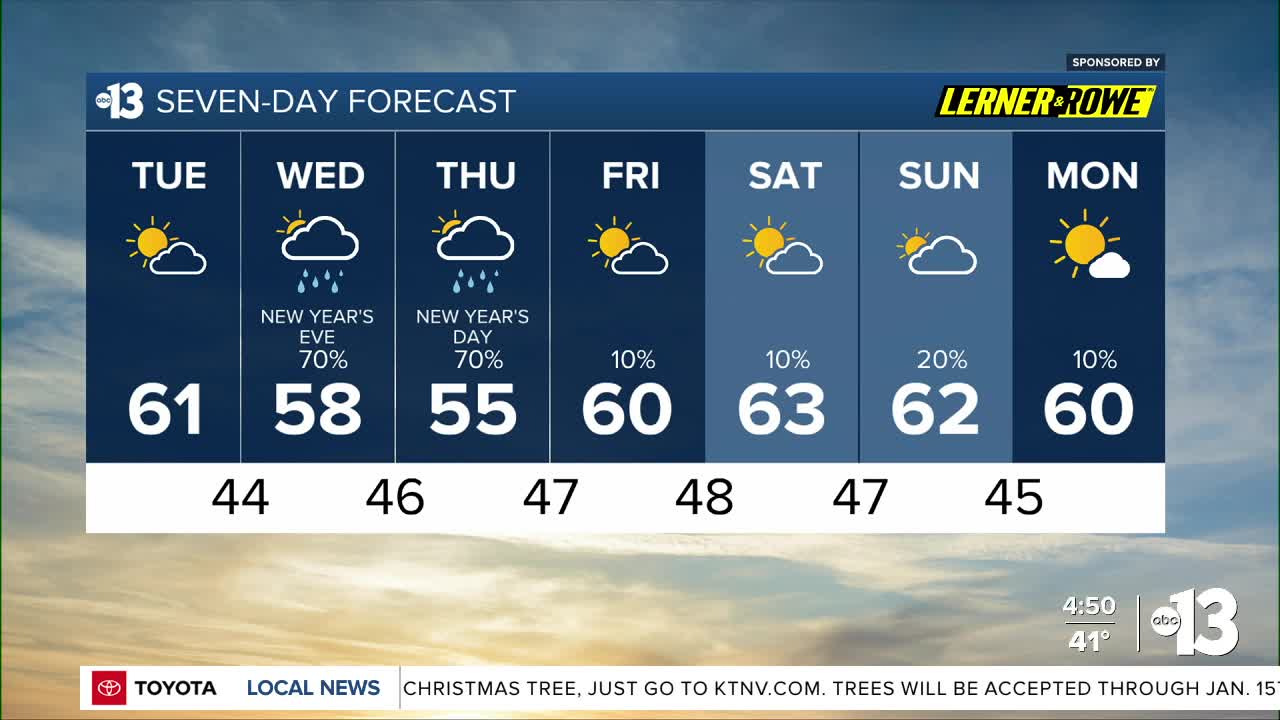 Rain chances increase on New Year’s Eve, climbing from 20% at midday to 70% in the evening, and lingering at 60% around midnight as we ring in 2026. Readings in the upper 50s Wednesday afternoon will fall near 50 by midnight, then dip to the mid 40s for lows.