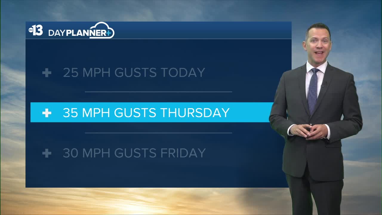 Thursday sees strong southwest gusts of 30-35 mph, and a Wind Advisory is in place from 11 a.m. through 5 a.m. Friday. Highs reach the low 80s tomorrow. The sky starts mostly cloudy and finishes partly cloudy.