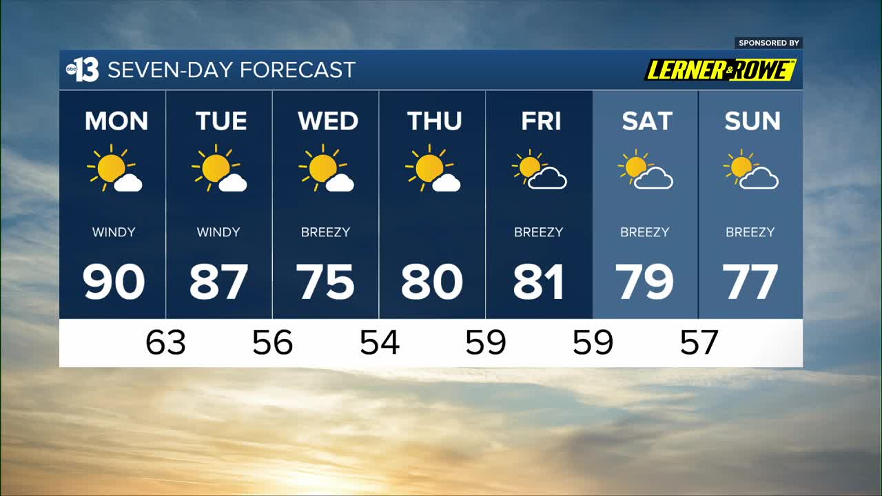 Wednesday is a bit cooler, in the mid 70s, as winds linger at 15-20 mph under a mostly sunny sky.