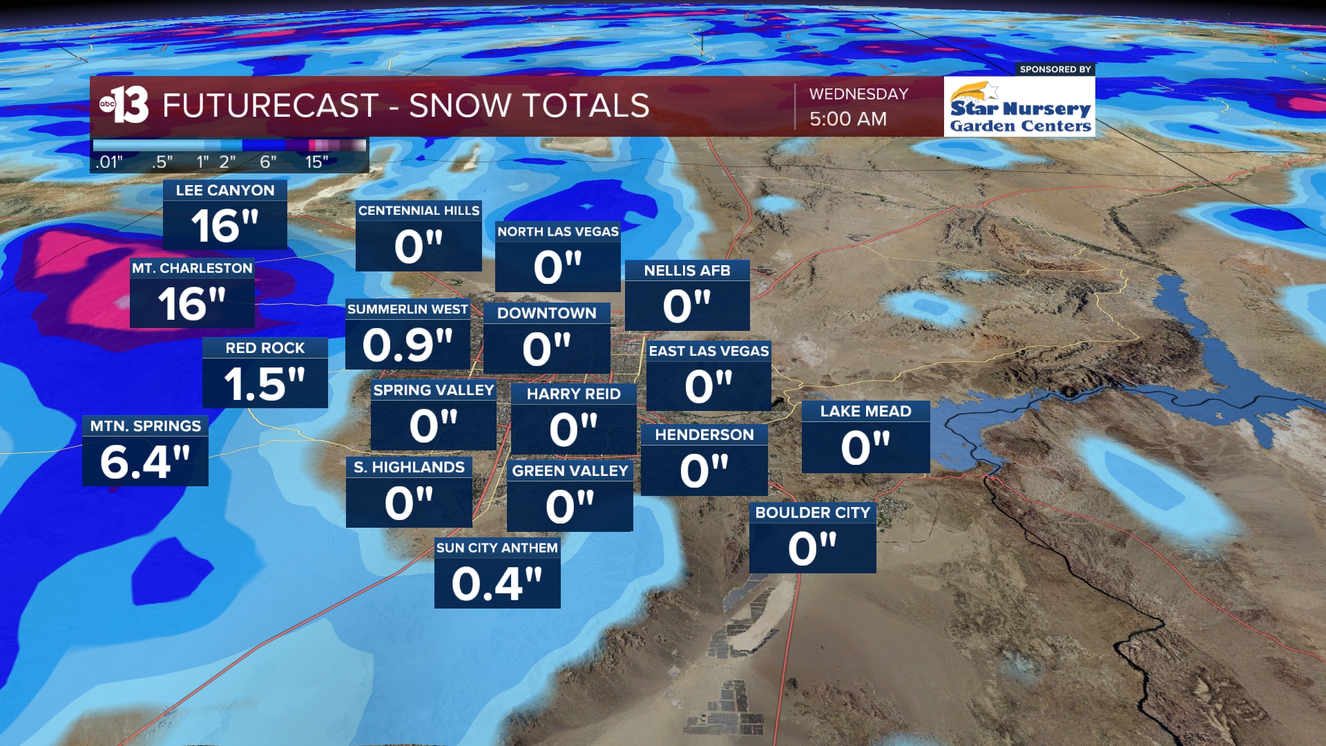The Winter Storm Warning for elevations above 5,000 feet continues through 10 p.m. Wednesday. Snow levels will drop below 5,000 feet as the next round of moisture moves through Tuesday night through early Wednesday morning. Total snowfall forecasts are 2 feet in Lee Canyon, 1-2 feet in Mt. Charleston, and 6″-12″ above 5,000 feet.