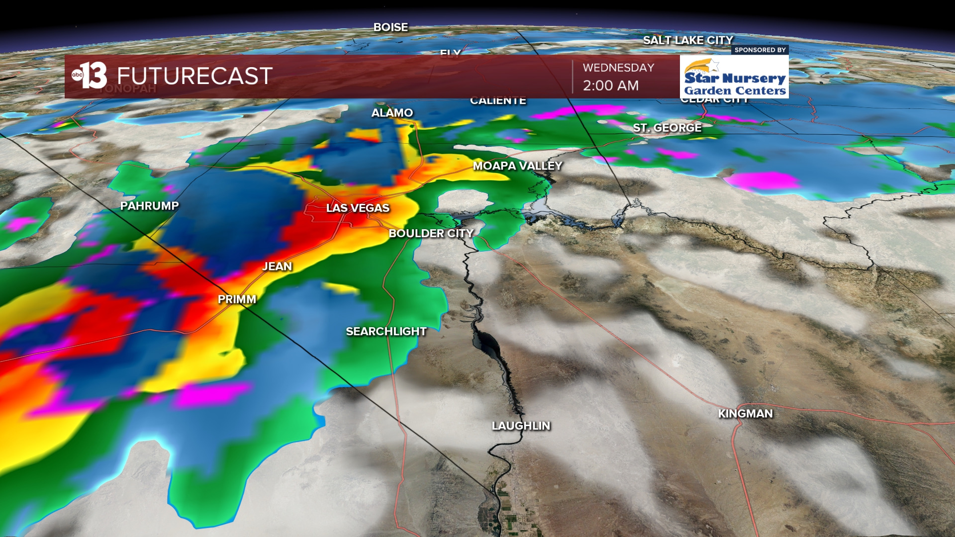 TONIGHT: A second round of rain reaches Las Vegas shortly after midnight, with a 70% chance of additional measurable rain. Readings will be in the 40s, but with colder air aloft, some snow showers will be in the mix in high elevation neighborhoods like Summerlin West and Anthem (where temperatures will dip to the upper 30s).